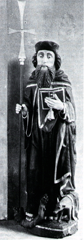 Geblieben ist dem hl. Antonius Eremita aber das Schwein. Auf zahllosen Bildern des Heiligen, auf denen er mit seinem T-förmigen Kreuzstab, an dem oft zwei Glöckchen hängen, zu sehen ist, schmiegt es sich vertrauensvoll an ihn, unter seinem schwarzen Abtsmantel hervorschauend. Aus dem oben Ausgeführten geht die Herkunft dieses Heiligenattributes hervor. Der T-förmige Stab, ursprünglich wohl der Wanderstab des Heiligen, war in Form eines stilisierten Krückstocks Wahrzeichen und Wappen des Antoniterordens - gleichsam als Bild der Hilfe, die den Erkrankten und durch das „Feuer" Verstümmelten geleistet wurde. Wie er den meisten Darstellungen St. Antons beigegeben ist, führten ihn auch die terminierenden Brüder mit sich und machten sich bei ihren Kollekten mit den anhängenden Glöckchen bemerkbar.