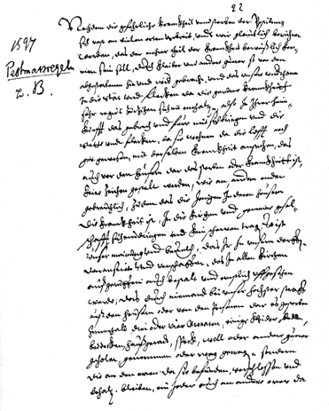 Nachdem die gefehrliche Krankheit und Sterben der Pestilenz sich vast an vielen Orten verbreit und wir glaublich berichtet worden, das der mehrer theil der Krankheit beweißlich kommen sein soll, durch Kleider und andere gütter so von den abgestorbenen hin und wied(er) gebracht, und das unsere underthann in die stät und flecken da die geredte (?) (=genannte) Krankheith sehr regirt zuzihen sich nit enthalten, alßo zu ihrer heimkunfft das gebrecht und teuer (=Fieber) mit sich bringen und die statte und flecken, da sie wohnen da die Lufft noch gut gewesen, mit derselben Krankheit anstechen, das auch vor den heußern dar das sterben oder Krankheith ist, keine Zeichen gestelt werden, wie an anderen enden gebreuchlich, zu dem das die jenigen in deren heusern die Krankheit ist, in die Kirchen und gemeine geselschafft sich eindringen und kein scheuen tragen, so ist unser meinung und bevelh (=Be-fehl), das ir in unseren dorffern daranseiet und verschaffen, das in allen Kirchen aufgerufen auch bestalt und ernstlich uffgesehen werde, das durch niemand bei unserer höchsten Straff aus den Heusern oder von den Personen dar es gestorben innerhalb drei oder vier Monaten, einige Kleider, Bedden, Beddecken, Haußgeradt, Speck, woll oder anderer gütter geholet, genommen oder weggetragen, sondern die an den orten da sie befunden, verschlossen und behalten bleiben, ein jeder auch an andere orten da es der Pest halber gefährlich zu reisen, sich soviel immer möglich meide, und die es darüber mutwillig thun werden, nit sobalt wid(er) in unsere Stätte und flecken genommen sondern eine Zeitlang daraussen gehalten, auch vor die heuser da die Krankheit gewest oder noch ist, ein bündlein stroes (=Stroh) zu einem Zeichen aufgestechen werde, da neben diejenigen da die Krankheit in den Heusern war oder die Ihrer waren, nit zur Kirche, Straßen oder und(er) die gemeine od(er) geselschafft sich mengen sondern in den heusern verhalten oder außgehen und wandeln, da es einsam ist, und das daneben den Kranken Notturfft bestellet und gebracht werde, den Reichen umb Ihrer Bezahlung, und den armen durch andere versehung der Provisoren, Brudermeister und Kirchenmeister, oder einer von Ambtswegen, wo auch einige heuser aussterben, das dieselbi-gen verschlossen gehalten und Niemand sobalt darzu gelassen werde, damit solche beschwerliche Krankheit mit gnaden des Almechtigen nit weiters einreißt oder oberhandnehme, wie wir auch nit verdienlich erachten, das die Pastoren und Prediger den gemeinen Man von der