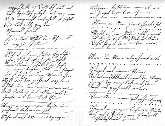 Bis auf das letzte Rezept sind alle wie aus einem Guß aufgezeichnet. Wie Schrift und Tinte zeigen, müssen sie zeitlich schnell und hintereinander zu Papier gebracht worden sein. Daß die Rezepte nicht auf einmal und von einer Vorlage abgeschrieben wurden, geht dabei aus den unterschiedlichen Abtrennungen der einzelnen Rezepte durch Striche, geschweiften Klammern sowie geschlossene und getrennte Wellenlinien hervor. Lediglich das 25. Rezept zum Schönen trüben Brandweins ist später mit blasserer Tinte und flüchtigerer Schrift nachgetragen.