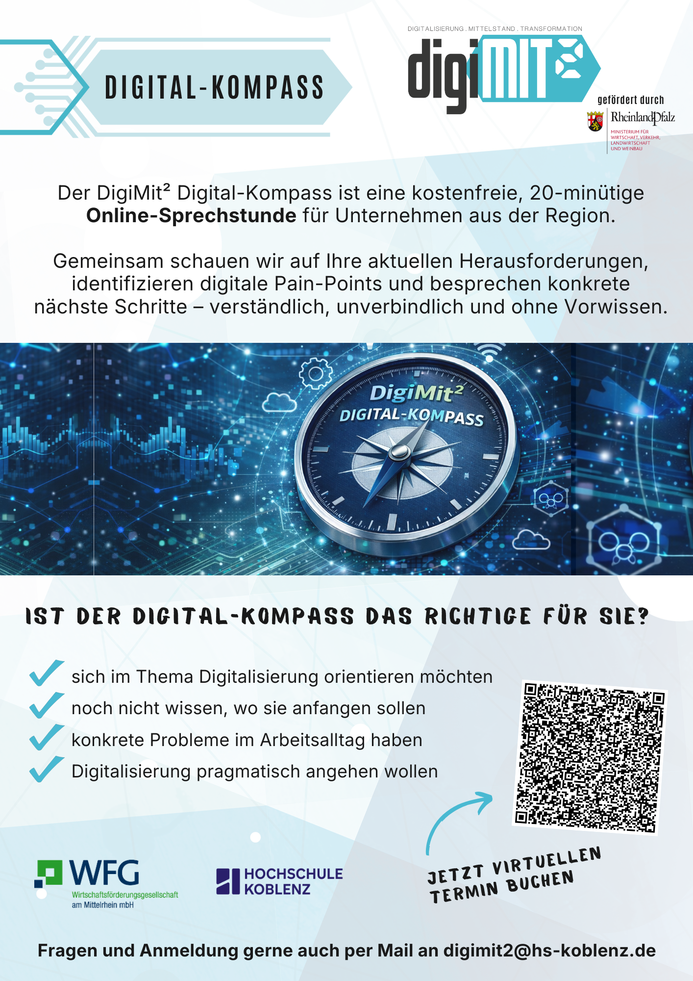 Der Digital-Kompass richtet sich bewusst auch an Unternehmen, die bisher wenig Berührung mit dem Thema Digitalisierung hatten und sich zunächst Orientierung wünschen – ohne Verpflichtungen, ohne Vorwissen und ohne Umsetzungsdruck.