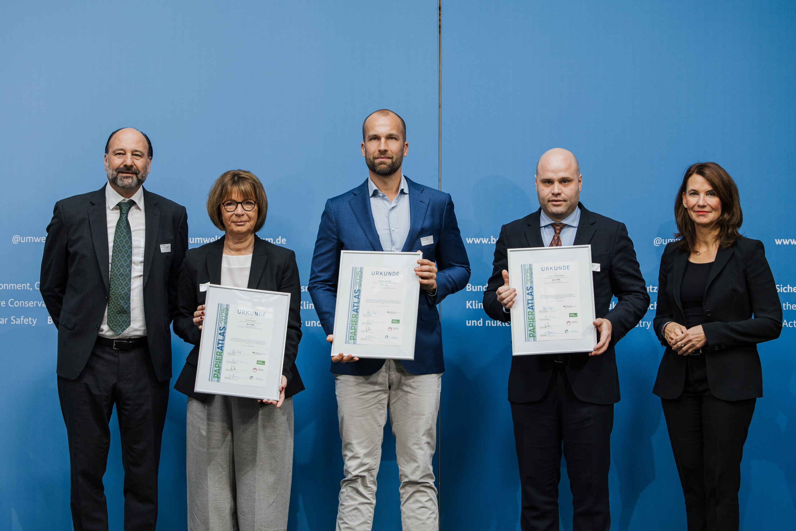 Ehrung des Kreises Ahrweiler, des Landkreises Bad Kreuznach und des Landkreises Starnberg auf dem 3. Platz der „Recyclingpapierfreundlichsten Landkreise“ 2025, v. l. n. r.: Marc Gebauer (Sprecher der Initiative Pro Recyclingpapier), Sabine Glaser (Kreisbeigeordnete des Kreises Ahrweiler), Lucas Lamberty (Bürger und Vertreter des Landkreises Bad Kreuznach), Christopher Kühner (Geschäftsbereichsleiter Umwelt des Landkreises Starnberg), Parlamentarische Staatssekretärin Rita Schwarzelühr-Sutter © BMUKN/Sascha Hilgers