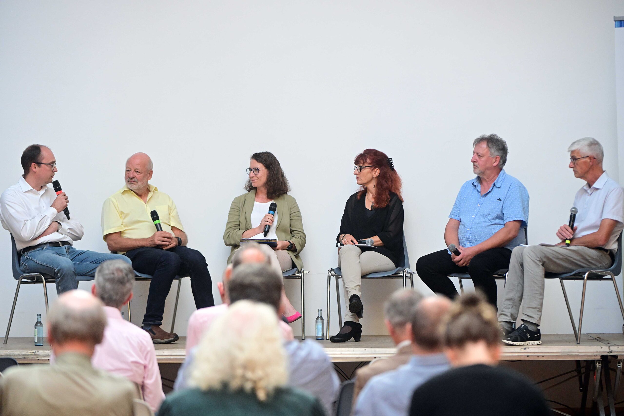 Teilnehmende des Podiumsgesprächs: v.l.n.r. Jörn Kampmann (SPD), Hans-Josef Fell, Cornelia Weigand, Susanne Henn (Moderation), Matthias Heeb (B90/die Grünen), Reiner Friedsam (FWG)