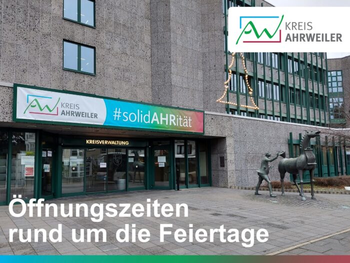 - Die Kreisverwaltung Ahrweiler ist in der Zeit von Mittwoch, 24. Dezember 2025, bis einschließlich Donnerstag, 1. Januar 2026, geschlossen. Am Freitag, 2. Januar 2026, ist die Kreisverwaltung wieder geöffnet und es gelten die regulären Öffnungszeiten.