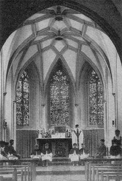 Die in Goldverzierung betonten Konsolen erhöhen den Gesamteindruck. In noch hellerem Ton ist der Grundanstrich im Chor gehalten, noch schärfer ist das reiche elegante Sterngewölbe, dessen Schlußsteine von besonderer Form und Ornamentierung sind, herausgestellt worden. Aus diesen Schlußsteinen in Karminrot und passenden Nebenfarben sind die zwei Halbfiguren vom Schmerzensmann und dem 'hl. Laurentius in wundervoller Kleinarbeit geschlagen worden. Ein besonderes Kleinod der Kirche ist der frühere Abstellraum geworden. Als Taufkapelle wurde er in späterer Zeit an die Kirche angebaut, hatte jedoch seine Aufgabe kaum erfüllt,. da bisher die Taufe — wenn auch das wichtigste Sakrament — mehr am Rande ohne festliche Betonung meist gespendet wurde. Die Taufkapelle selbst ist ein unregelmäßiger fünfeckiger Bau. Trotz dieser äußeren Unregelmäßigkeit wirkt er als geschlossene Einheit und wohltuend auf den, der sich innerhalb des Raumes seiner Wirkung hingibt. Auf einer runden Basaltplatte steht der Taufstein in konischer Form. Durch den Aufbruch nach dem Haupteingang zu ist die Taufkapelle in das Blickfeld der Gläubigen gerückt und erhöht die Festgestaltung bei der Feier der einzigartigen Liturgie in der M. Osternacht.