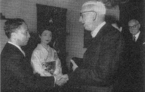 Sein Nachfolger war nur ganz kurze Zeit in Oberwinter. Als sich das politische Kräftespiel in Japan änderte, beriefen ihn seine Freunde in die Regierung nach Tokio. Seit zwei Jahren vertritt Botschafter Takeuchi sein Land in Bonn. Sein gastliches Haus gibt zuweilen Oberwinter ein ostasiatisches Gepräge. Kinder und Studenten, Arbeiter und Diplomaten, Frauen im Kimono und in Ordenstracht sind bei festlichen Gelegenheiten Gäste in der Residenz. Dabei spüren auch wir, wie der Botschafter und seine Gattin den in der Bundesrepublik zerstreut lebenden Landsleuten eine Heimat zu schaffen verstehen. Zwar blühten in diesem späten Frühjahr 1958 die japanischen Kirschbäume noch nicht, aber die japanischen Kinder in ihren farbenfrohen Kimonos ließen doch ein echtes Kirschblütenfest am 29. April werden. Als dann am 8. Mai 1958 zwischen 18 und 20 Uhr beim großen Empfang doch noch die Sonne strahlte, während sie sich den ganzen Tag scheu hinter schwarze Regenwolken verhüllte, offenbarte sie ihren Dank, weil ihr goldnes Bild symbolhaft über dem Eingang dieses Hauses glänzt, und sie in der Fahne dieses Landes lebt. Ihre Strahlen, die die Gäste aller Staaten wohltuend empfanden, kündeten vernehmlich, daß auch die schwärzesten Schatten weichen müssen, wenn die Menschen nur glauben, hoffen und lieben.