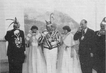 „Hell erklangen die Fanfaren und weit öffneten sich die Türen, weiter noch die Her= zen. Von den Ufern des Rheins brachten rheinische Menschen Freude und Frohsinn auf die Höhen des Berges. Schnell verband das Gespräch die Menschen verschiedener Zungen. Da man diesmal weder kölsch noch deutsch sprach, versuchten wir es mit englisch oder französisch (soweit das noch ging!). Doch da, wo ein Bogen zum Brückenbau fehlte, spann ihn die Vielfalt der menschlichen Gebärde. Und in der Zeichensprache waren gerade unsere ]üngsten, die 12jährigen des Tambourkorps, besonders groß. Mit den Kaviarpastetchen wußten sie nicht Rechtes anzufangen, aber mit den kleinen Türken schlössen die große Freundschaft. Diesen hatte es die dicke Trommel besonders angetan, und der gewaltige Krach im Hause machte ihnen höllischen Spaß. Aber auch die Großen waren voll kindlicher Freude. Der türkische Chefkoch inmitten des Prinzen und seiner Hof= damen fühlte sich mit in dem närrischen Treiben gefangen. Er wird mit dem Bilde auch die Erinnerung in seine Heimat tragen. Der Abschied mit klingendem Spiel wurde zu einer Ovation für die diplomatische Vertretung der türkischen Nation."