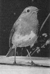 Für eine Weile gewöhnte er es sich an, seine Morgentoilette auf dem Tisch neben meinem Bett zu machen. Er saß auf der Tischdecke, oft kaum eine handbreit von meinem Kopf entfernt, und putzte sich die Federn, streckte Flügel und Beine lang aus, gähnte, oder was immer diese Bewegung bedeutete, und trank aus meinem Wasserglas, sehr anmutig und zierlich. Ich bin sicher, daß ich es lange Zeit gar nicht bemerkte, denn er war ganz leise. Außerdem erschien er wahrscheinlich schon, als es noch dunkel war, denn das Rotkehlchen, als Dämmerungstier, gehört zu den allerersten Aufstehern.