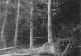 Das Bild stellt die „Harfentanne" aus dem Hümmeler Gemeindewald dar, die als Naturdenkmal unter Naturschutz steht. Die vor mehr als 50 Jahren entwurzelte Tanne fiel zu Boden; nur die Hälfte ihrer Wurzeln gründen noch ins Erdreich. Diese wenigen Wurzeln ernähren nicht nur den waagerecht liegenden Stamm, sondern auch noch sieben Tannen, die sich aus Zweigen des Stammes entwickelten. Wanderer, bewundere und schone diese Harfentanne!