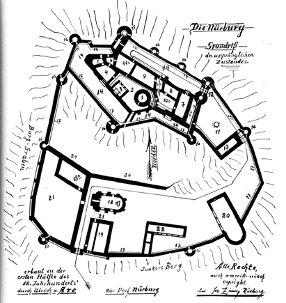 24 eine Stützmauer, die die Vorburg gegen den Berg zur Hauptburg zu abstützte, so daß von der Stützmauer nordwärts noch Gartenland vorhanden war (es könnte auch ein Turnierplatz gewesen sein).