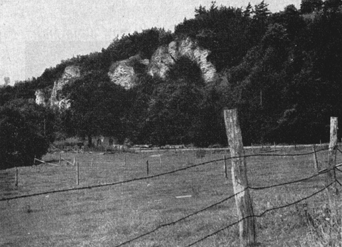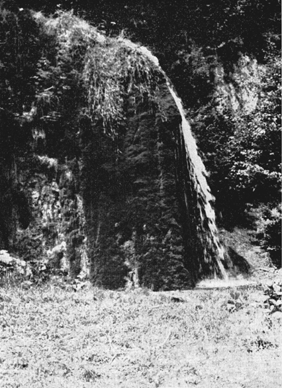Am Ahbach unterhalb der Nohner Mühle springt ein Bächlein, das auf der linken Seite dem Ahbache zueilt, dicht vor seiner Mündung von der unteren Mittelterrasse auf die Niederterrasse über einen Kalkfelsen und bildet einen haushohen Wasserfall. Während aber die Wasserfälle die Felsenbänke abnagen, so daß der Rheinfall bei Schaffhausen und die Niagarafälle des Lorenzstromes jedes Jahr einige Zentimeter zurückwandern, so beobachten wir am Nohner Kalkfelsen das Gegenteil. Jedes Jahr baut sich dieser Kalkfels backofenförmig um 1—2 cm weiter vor. Wie ist diese eigentümliche Erscheinung zu erklären? Westlich des Nohner Baches liegt die Kalkeifel. Die Ahr entspringt in der Blankenheimer und der Ahbach in der Hillesheimer Kalkmulde.