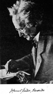 Hofzimmer, ein in Mülheim lebender, tüchtiger Mann, öffnete ihm das Tor in die Zukunft. Er begriff rasch, daß er einen jungen Menschen vor sich hatte, der nicht aus Zeitüberfluß so weite Wege machte. Johannes durfte bald bei den Proben des Domchores zuhören. Das war eine außerordentliche Vergünstigung. Von Köln führte ihn der Weg zur Kirchenmusikschule nach Aachen, wo er Lieblingsschüler des später durch ein Denkmal geehrten überragenden Kontrapunktikers Prof. Neekes wurde. Ihm verdankte Müller die Wegweisung zu Palestrina, den man mit Recht einen Fürsten der mittelalterlichen Musik genannt hat. Palestrina steht in seiner Weise an einem Wendepunkt der musikalischen Entwicklung und hatte durch den Mund Neekes' dem bergischen Bauernsohn vieles zu sagen. Und er nahm es so tief in sich hinein, daß er bis zum Tode dem mittelalterlichen Meister die Treue hielt. Auch für Müllers eigenes Schaffen wurde er entscheidend. Nach Abschluß der Aachener Studienzeit entschied sich Müller, den man gerne im Kölner Gebiet behalten hätte, für ein Angebot des damaligen Dechanten Seul nach Ahrweiler. Von Jahr zu Jahr ergriff er die ihm gestellten Aufgaben und Möglichkeiten immer mehr. Und das waren nicht nur musikalische. Er war Küster, wurde verantwortungsbewußter Familienvater und Winzer. Mit welchem Eifer er sich das den bergischen Vorfahren fremde Gebiet des Weinbaus erobert hat, bezeugt, daß später auf der Höhe seiner Komponistenlaufbahn nach der glanzvollen Uraufführung seiner großartigen „Missa solemnis" in Bonn ein geistlicher Herr der Beethovenstadt in der Festrede sagte: „Johannes Müller schreibt nicht nur weitum die besten Messen, sondern keltert auch einen der besten Weine."