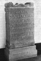 „ . . . zu Ehren des göttlichen (d. h. des kaiserlichen Hauses) hat Arcias Marinus, Priester des Dolichenus, den Reitern der Kohorte I Flavia ein Geschenk gemacht, unter dem Konsulat des Dccius und Gratus."