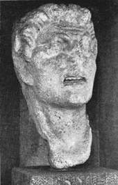 2. ein Jupiterkopf aus weißem Kalkstein (Nr. 15 des Führers). Das majestätische Haupt ist von Locken umwallt. Die Nase zeigt starke Beschädigungen auf. Nach der Größe des Hauptes zu urteilen, war es wohl die Krönung eines Viergöttersteines, bei dein Jupiter auf eine Säule postiert war, die vielleicht von einem würfelförmigen Quader mit Reliefdarstellungen der Remagener Götter getragen wurde. Es war so Brauch, der den keltischen und germanischen Vorstellungen eines Götterdenkmals entgegen kam.