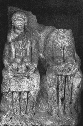 Dolichenusstein — Nr. 16 d. Führers. — Die Hauptgottheiten der Phönicier und Syrer in Kleinasien waren der Sonnengott Baal und die Erdgöttin Astarte. Als Gott des versengenden Feuers wurde er als Baal und unter dem Namen Moloch im Opfern von Knaben verehrt. Der Siegeszug der kleinasiatischen Kulte zieht sich bis ins 3. Jahrhundert hinein. Die Baale wurden nach den Städten, die ihnen gehörten,