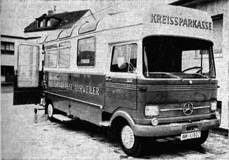 Zu den Hauptanliegen der Kreissparkasse Ahrweiler gehört die Pflege des Kundendienstes und der Kundennähe. Aus diesem Grunde hat sie in den letzten Jahren ihr Zweigstellennetz stetig erweitert. Um nun auch den Kunden, die in Orten wohnen, in denen sich die Einrichtung einer stationären Zweigstelle noch nicht lohnt, näher zu kommen, setzte die Kreissparkasse Ahrweiler im April 1967 ihre erste fahrbare Zweigstelle in Betrieb. Diese Einrichtung ist im Kreise Ahrweiler neuartig. Die Kreissparkasse fährt z. Z. wöchentlich 32 Orte im Kreisgebiet an. Die Haltezeiten in den einzelnen Orten betragen zwischen ein und zwei Stunden. In dieser Zeit hat der Kunde die Möglichkeit, sämtliche Geldgeschäfte an seinem Wohnort zu erledigen, so daß manchem der Weg zur nächsten Geschäftsstelle erspart wird.
