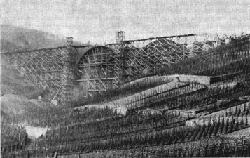 biets durch die Franzosen und die Einstellung des gesamten Eisenbahnverkehrs infolge des passiven Widerstandes zwang die Bauleitung zur Stillegung des Brückenbaues. Diese als provisorisch gedachte Bauruhe ging bald infolge der politischen Nachwirkungen des Krieges, der Ruhrbesetzung und des Niedergangs des gesamten Wirtschaftslebens durch die Inflation in eine dauernde über Das Schicksal der Brücke war besiegelt. Im Jahre 1924 wurde das Baugerüst abgebaut, und nur die nackten Säulenstümpfe blieben zurück. Sie stehen heute noch da, ein widriges Geschick beklagend und gleichsam die Arme, Hilfe für die Vollendung suchend, gegen Himmel streckend. Die großen Pfeiler in der Mitte sollten die drei Hauptbögen von je 36 Meter Spannweite tragen. Die Höhe der Brücke würde hier von der Talsohle bis zum Scheitel 40 Meter gemessen haben.