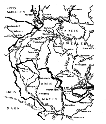 Der Trierbach als herkömmliche Nord-Süd-Grenze bis 1800 für das kurtrierische Amt Daun ist jetzt von Westen nach Osten überquert durch die Kreisgrenze zwischen Ahr-weiler und Mayen seit 1932. Gewiß fällt diese Durchkreuzung nicht mehr so stark ins Gewicht, seit der Motor die Entfernungen und Grenzen auch in der Hocheifel schneller überbrückt. Aber dem aufmerksamen Beobachter des Volkslebens werden viele Erscheinungen der Gegenwart oft leichter verständlich, sobald er überlegt, in welcher Weise die Dörfer der früheren Generation zueinander gehörten.