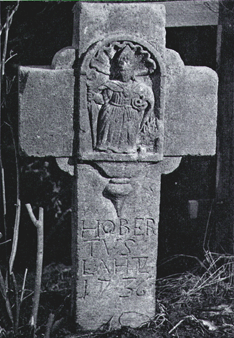 Hinzu kommt, daß die Schöpfer dieser Kreuze meist schreibunkundig waren, sich die Inschrift vorzeichnen ließen und dann die Schriftzeichen, nicht immer in der richtigen Reihenfolge, in den Stein schlugen. So nennt ein Grabstein den „GVNGERGESEHL DEGODORVS" (=Junggeselle Theodor), oder neben allgemein üblichen Abkürzungen wie G S D S G (Gott sei der Seele gnädig) liest man „IM H.e.S.CH." (im Herrn entschlafen).