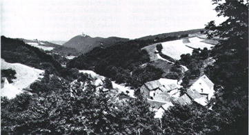 Ehe jedoch der weitere Bachverlauf verfolgt wird, lohnt sich ein Abstecher links oder rechts zur Höhe hinauf. Rechts erreicht man nach wenigen hundert Metern den Steinberg, und linker Hand ist es ebenfalls nicht weit zur Hannebacher Ley und weiter in nordöstlicher Richtung zum Perlerkopf, Bergzüge, weit dahingeschwungen, herrlich bewaldet und mit ihrer Höhe von annähernd sechshundert Metern eine majestätische Kulisse des Talbeginns bildend. Aber nicht nur die Berge selbst - wir finden in ihnen die charakteristischen basaltinen Formen der ältesten vulkanischen Erscheinungen -sondern auch der herrliche Weitblick fast über das gesamte Tal hinweg beeindruckt. Weniger beschwerlich, doch genau so eindrucksvoll bietet sich dieses Bild von der Schelborner Höhe, einige hundert Meter nördlich der genannten Kreuzung. Die waldige Talenge des oberen Teiles öffnet sich unterhalb der Olbrück zur lieblichen Mittelregion der Talaue, unterbrochen durch die Vulkanberge dieses Bereiches und wie eine Perlenschnur den Siedlungsverlauf entlang des Bachlaufes darbietend und den verschlossenen unteren Talbereich nur ahnen lassend. Und schließlich über der Lützinger und Keller Höhe die „blauen Berge" jenseits des Rheines - der Westerwald! Ein faszinierender Blick, der zum Verweilen einlädt, indem er dem Betrachter eine Gesamtschau des Brohltales bietet, die aus dieser interessanten Perspektive als wirklich einzigartig bezeichnet werden kann. Auch hier schon erscheint der Phonolithkegel mit der Burgruine Olbrück als der beherrschende Punkt des Tales, ein trutzirger Wächter, der wahrlich jahrhundertelang den Bewohnern Furcht und Schrecken einzuflößen vermochte.