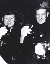 Dies war nun der erste Eß- und Trinkzug in Ahrweiler, das Modell für die Schützen. Nach Meinung der Schützen mußte, wenn der Bürgermeister schon vorgestellt wurde, auch ihr König entsprechend geehrt werden. Deshalb stellten sie ihren König auch auf den 24 Höfen, dazu aber auch bei den Kaufleuten und Winzern der Stadt vor. Da die Schützen aber zu Hunderten rundzogen, konnten sie nicht in die Häuser eintreten, sondern wurden vor den Häusern bewirtet. Um nicht zwei Arbeitstage opfern zu müssen, hielten sie ihren Trinkzug in der Nacht. Vom Verlauf des Schützenzuges möge Ernst Karl Plachner, unser heimischer Dichter, berichten: