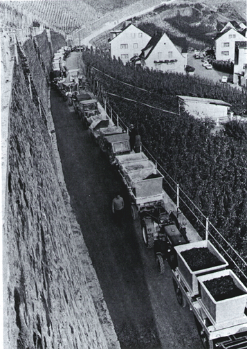 Die Modernität dieser Geschäftsführung der Vereinigten Winzergenossenschaften mit dem Status einer eingetragenen Genossenschaft ist überzeugend. Selbstredend ging damit parallel eine Aufbesserung des technischen Betriebes. Früher waren zwei Mannschaften von 24 Mann notwendig, wenn die Trauben im Herbst angeliefert wurden — heute leisten das vier Mann dank des automatischen Entlademechanismus und der Abbeermaschine, die die Beeren von den Stengeln trennt. Automatisch ist auch die Waage, übertragen werden die Ergebnisse von Gewicht und Oechslegraden auf Lochkarte, die gleichzeitig die Mitgliedsnummer des abliefernden Winzers, die Lage und die Sorte ausweist. Diese Lochkarte kann jederzeit „befragt" werden und ist in ihren Einzeldaten automatisch addierbar. Die Datenverarbeitung bringt's zuwege. Angeliefert wird die Ernte in Dernau sowie an der Bad Neuenahrer Heerstraße.