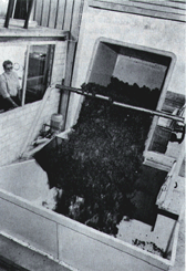 Bewältigung des Lesegutes dient die automatische Anlage, die die Trauben von