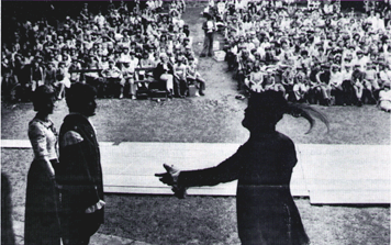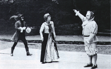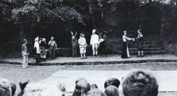 Ein Mysterienspiel als nächstes vom „Geiger unserer lieben Frau", danach die Legende der Heiligen Elisabeth. Dann das Wagnis mit Hofmannsthals „Jedermann" wie vor dem Portal des Domes in Salzburg! Die Gestaltungsfreude der Laienspieler gewinnt an Darstellung und Kraft, an Sprechkultur und Gestik und mimischer Resonanz.. Einige Berufsschauspieler kommen zur Aufführung von „Wilhelm Teil"; die Naturhaftigkeit dieser Bühne gewinnt auch damit Leben, daß aus der Waldlichtung Gessler und Gefolge zu Pferd heranreiten.