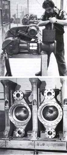 Dazu bedarf es besonderer Pumpen. Kreiselpumpen sind zum Beispiel nicht in der Lage, die notwendigen Drücke zu liefern; herkömmliche Pumpen unterliegen einem allzu raschen Verschleiß, wenn ihre beweglichen Teile mit dem mechanisch oder chemisch aggressiven Transportgut unmittelbar in Berührung kommen. Der Weg des Josef Emmerich: Grundlage ist das Kolbenpumpen-System, weil es die notwendigen Energien überträgt; aber die Energie der Kolbenarbeit wirkt nicht unmittelbar, sondern über ein Ölreservoir von konstantem Volumen auf eine widerstandsfähige Membrane ein und diese wiederum auf das Transportgut — mit Drücken bis zu 250 Bar.