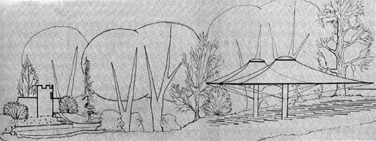 Aufführungen haben. Links die Freilichtbühne, rechts die beiden aufspannbaren, quadratischen Schirme, die 300