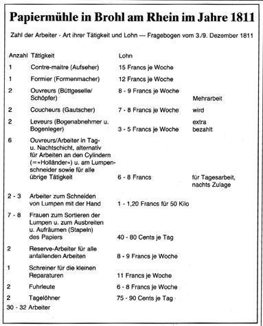 »deutsche Reich«. Der günstige Schiffsverband über die Brohler Hafenbucht brachte der Fabrik dabei gegenüber den Konkurrenten manchen Vorteil. Während für 1804 von 16 »steten« Arbeitern gesprochen wird, arbeiteten 1806 und 1810 »19 bis 29« Männer und Frauen im Betrieb, letztere vor allem beim Sortieren der Lumpen. Die Zahl der Beschäftigten stieg 1811 auf 32,1819 sogar auf 60, die jedoch in den einzelnen Jahren »nicht jeden Tag vollständig im Betrieb erreicht« wurde; viele von ihnen waren sicherlich nur auf Abruf verpflichtet.Für das Jahr 1811 gibt nachfolgende Zusammenstellung (nach LHA Koblenz 612 3860) eine Übersicht über die Zahl der Beschäftigten und ihre Entlohnung.