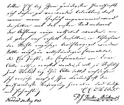 Unterschrift von Pieter Jacob van der Muelen. Aus dem Schreiben »Neuwied, 24. May 1 792« an den Verwalter der von der Leyen'schen Güter in Brohl, den Dorfschultheißen Peter Wihl (Fürstl. von der Leyen'schen Archiv in Waal Nr. 4827