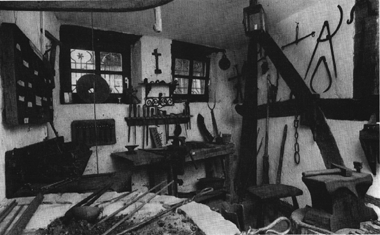 Eine steile und enge Treppe führt in das Untergeschoß, wo in der Kühle und Stille, in den Winkeln, der Fleiß der Vorfahren nistet. Hier fällt gleich der Blick auf die liebevoll zusammengetragenen alten Zunftbriefe und Urkunden; denn die Zünfte leben gerade in diesem kleinen Museum fort. Ein besonderer Blickfang ist auch die Sammlung alter Fotos vom 13.6.1910, als Adenaus schwere Stunde in einem gewaltigen Hochwasser schlug. Zur Rechten tritt man in eine original wieder eingerichtete alte Adenauer Werkstatt eines Nagelschmieds. Aus den Überlieferungen ist bekannt, daß gerade die Nagelschmiede in Adenau mehrfach vertreten waren und auf eine heute kaum mehr vorstellbare Art und Weise ihr karges Brot verdienten. Gleich acht solcher kleinen, meist Familienbetriebe, gingen hier ihrem nicht leichten Gewerbe nach. Die Werkstatt des letzten Nagelschmiedemeisters befand sich im gleichen Hause und der alte Meister Mathias Schirmer starb 1912. Betrachtet man im Museum seine alte Werkstatt, glaubt man, daß der Meister jeden Augenblick wieder durch die niedrige Türe treten wird, neben der sein Bild hängt. Die Nagelschmiede enthielt eine, für heutige Verhältnisse recht dürftige Einrichtung. Unweit des Fensters stand der Amboß, damals »Stock« genannt. Auf der Esse loderten die Flammen, die von einem ständig pustenden Blasebalg aus den glühenden Kohlen getrieben wurden. In die Glut ragten zahlreiche, nur bleistiftdicke Rundeisenstangen von unterschiedlicher Länge, aus denen die Nägel gefertigt wurden. Das Geheimnis des Blasebalgs war nicht gleich zu erkennen. Der Meister war im