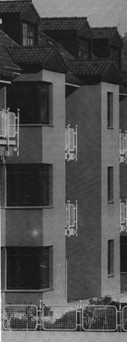 Nicht nur die Liebe zum Detail von Architekt Erwin Lynen aus Aachen ist das Geheimnis. Die vielen Erker, Balkone und spitzen Dächer, die abwechslungsreich gestalteten Fensterflächen lenken eigentlich nur ab vom Geist dieser Wohnanlage. Obwohl an die 500 Leute hier untergebracht werden können, sind alle Häuser in der dem Menschen angeborenen Maßstäblichkeit angelegt. Jedes Haus für sich betrachtet ist nicht höher und wuchtiger als eine romantische Rheinvilla aus dem vergangenen Jahrhundert, alles ist überschaubar, jeder Baukörper der in sieben Gruppen unterteilten Anlage wirkt wie ein einzelnes Haus.