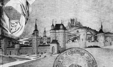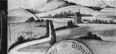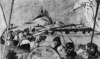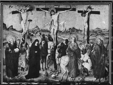 Am Horizont sehen wir drei markante Erhebungen. Steht man auf den Höhen von Linz, sieht man genau die gleichen. Es sind von rechts nach links die Landskron, der Neuenahrer Berg und die Olbrück. Alle drei Berge hatten zur Zeit der Herstellung des Bildes nicht nur eine landschaftliche, sondern auch politische Sonderstellung. Denn von diesen Höhen wurde das Geschehen im »Reich« Sinzig mit beeinflußt. Rechts von dem gekreuzigten Übeltäter, aus dessen Körper ein Teufel die Seele in Form eines kleinen Kindes zieht, sehen wir die zum Rhein hin fließende Ahr. Rechts davon zweigt von der Ahr der bereits 1297 urkundlich erwähnte Deich zum deutlich erkennbaren Godenhaus ab. Dahinter läßt sich in der Ferne die Lage Bodendorfs erkennen. Zwischen dem gekreuzigten Jesus und dem rechts gekreuzigten Übeltäter ist nun die Stadt Sinzig mit ihrer Ummauerung zu erkennen. Direkt in das Blickfeld tritt die 1348 fertiggestellte Wasserburg mit dem urkundlich nachgewiesenen Ausgang zur Ahr hin. Die gemalte Burg hat, genau wie es uns überliefert ist, 3 Stockwerke und 4 Türme. Rechts von der Burg ist in der Stadtmauer ein Wachturm und des weiteren das Mühlenbachtor erkennbar. Links zwischen der Burg und der »Leepforte« sind zwei Wachtürme in der Stadtmauer. Auch ist links von der Burg der spitze Turm der Sinziger Kirche und etwas davor das Türmchen der Uhrglocke deutlich erkennbar. Links von dem gekreuzigten Christus ist vor dem Leetor der Stadt die Mauritiuskapelle auf dem Helenenberg (die bereits 1322 vorhanden war) mit einem zusätzlichen Gebäude wirklichkeitsgetreu wiedergegeben. Noch weiter links ist eine große Gruppe bewaffneter Männer zu sehen, die sich vom Geschehen auf Golgata zurückhält. Sie führt eine Fahne mit dem doppelköpfigen Reichsadler, deren Tragen der kaiserlichen Truppe sowie den Reichsstädten — und damit Sinzig — vorbehalten war. Die Gruppe könnte somit die in respektvoller Entfernung stehende Sinziger Bürgerwehr darstellen. Vergleicht man die auf dem Altarbild gemalte Stadt Sinzig mit der Zeichnung von Sinzig auf dem Meisterbrief der Sinziger Hammerzunft von 1750, sind Parallelen mit Burg, Kirche, Stadtmauer, Stadttore und Wachtürme sowie der Maritiuskapelle erkennbar. Es ist erstaunlich, daß man in der 500jährigen Geschichte des Bildes, bei den Bildbeschreibungen, bei den erfolgten Renovierungen und sonstigen Betrachtungen dem Bildhintergrund bisher keine Beachtung geschenkt hat. Dies ist sicher darauf zurückzuführen, daß die Restaurateure und ortsfremde Priester mit der geographischen Lage Sinzigs und seiner ehemaligen Befestigungsanlage nicht vertraut waren, daß das Bild im Altarbereich hing, der eine nähere Betrachtung früher nicht zuließ und daß das Bild Jahrhunderte abgestellt und der Öffentlichkeit nicht zugänglich war.