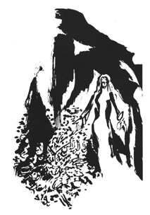 Zögernd stieg er, die Blume fest in der Hand haltend, in das Gewölbe hinab und erblickte darin eine weiße Jungfrau, die schweigend mit der rechten Hand auf einen Haufen Schätze zeigte, gleichsam als wolle sie ihn auffordern, davon zu nehmen. Der Ritter, seiner armseligen Kleidung und seiner Bedürftigkeit bewußt, legte die blaue Blume zur Seite auf die Erde nieder und griff mit beiden Händen in das Gold und die Schätze, um sich die Taschen zu füllen. Dann wandte er sich um und wollte sich entfernen. Da rief ihm eine Stimme zu: »Vergiß das Beste nicht!« Der Ritter aber dachte nicht mehr an die seltene Blume, sondern nur noch an die Schätze. All sein Sinnen und Trachten war nur noch auf den gefundenen Reichtum ausgerichtet.