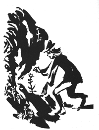 Auf der Höhe leuchtete ihm schon von weitem eine wunderschöne blaue Blume entgegen, wie er noch nie eine gesehen hatte. Er eilte hinzu, beugte sich tief über sie, um ihren Duft einzuatmen und beschloß, diese einzigartige Blume mitzunehmen, um sie seiner Herzliebsten daheim zu überreichen. Also pflückte er sie ab und, o Wunder, kaum hielt er die Blume in seiner Hand, da sah er vor sich den Eingang zu einem unterirdischen Gewölbe. Dort, wo ursprünglich die blaue Blume gestanden hatte.