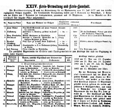 Kreiskasse betreute, und ein Kreisbote zur Verfügung.Im Mittelpunkt der Kreisordnung vom 13. Juli 1827 steht die Bildung der Kreisstände und der Kreisversammlung, mit deren Einrichtung die Grundlagen der kommunalen Selbstverwaltung auf Kreisebene geschaffen wurden. Es handelte sich jedoch nur um bescheidene Ansätze, da der Zweck der Kreisversammlung allein darin gesehen wurde, »die Kreisverwaltung des Landraths in Communalangelegenheiten zu begleiten und zu unterstützen.« Diese ausschließlich beratende Funktion beinhaltete jedoch, daß im Jahre 1841 der neue Landrat Schraut nicht mehr ohne Beteiligung der Kreisstände bestimmt werden konnte. Die Kreisversammlung (Kreistag) Ahrweiler bestand aus 16 Mitgliedern, die sich auf die drei Kreisstände wie folgt verteilten: 6 Rittergutsbesitzer, 3 Abgeordnete der Städte (Ahrweiler, Remagen, Sinzig), 7 Vertreter der Landgemeinden.