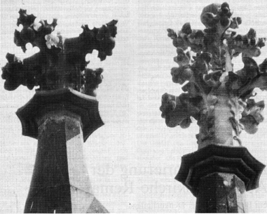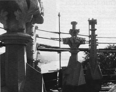 Steinmetzen ein genaues Maßnehmen ermöglichten. Damit hatten die praktischen Arbeiten begonnen. An der Apsis fehlten die aufragenden Teile der Fialen und Wimperge. Diese Teile wurden in der Kölner Steinmetzwerkstatt Karl-Günther Eich neu angefertigt und im Frühjahr 1986 montiert. Außerdem wurde das Gestein der Apsis und des Ostgiebels mit Heißdampf gereinigt und anschließend imprägniert. Schadhafte Teile des Maßwerks wurden erneuert, das gesamte Mauerwerk neu verfugt. Das Schieferdach über der Apsis wurde von Grund auf neu eingedeckt. So ist dieser umfangreiche Bauabschnitt fast vollendet. »Fast vollendet« - weil sich während der Bauarbeiten herausstellte, daß die Baldachine über den sechs Heiligenfiguren der Außenapsis viel stärker beschädigt waren als man ursprünglich angenommen hatte. Dadurch wurde der finanzielle Rahmen gesprengt, so daß die Erneuerung der Baldachine, die ziemlich teuer ist, in den nächstfolgenden Bauabschnitt verschoben werden muß.