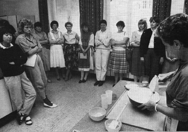 Für die Frauen des ländlichen Raumes bietet der Landfrauenverband des Kreises Ahrweiler ein umfangreiches Programm fachlicher und geselliger Art an. Die langjährige Leiterin der hauswirtschaftlichen Abteilung, Frau Oberstudienrätin Resi Kaasen, engagierte sich sehr stark für die Belange der Frauen in den Dörfern des Kreises. Sie baute zusammen mit der bis Mai 1986 amtierenden Vorsitzenden, Frau Elfriede Fuchs, Eckendorf, diese Organisation auf. Die Geschäftsführung des über tausend Mitglieder zählenden Verbandes liegt heute in den Händen der Abteilungsleiterin, Landwirtschaftsrätin Beate Bimmer. Dadurch liegt auf der Hand, daß viele Veranstaltungen der Mitarbeiterinnen auch auf die Zielgruppe »Frauen im ländlichen Raum« abgestimmt sind. Hier schimmert noch ein Hauch der ursprünglichen Wanderberatung durch, wenn die Kolleginnen, die Wagen vollgepackt mit Anschauungsmaterial für Vorträge und Vorführungen, in die Dörfer fahren, um den Landfrauen weite Anfahrtswege zu ersparen und trotzdem fachliche Information zu vermitteln.