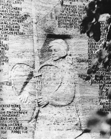 Nicht nur die Namen der Gefallenen, sondern auch die der Bombenopfer hat Hanns Matschulla in das große Ehrenmal vor dem Ahrtor von Ahrweiler eingemeißelt. Er füllte den Quader such mit dem weiterführenden Leben: Hier wird der Weinstock zur Bogrebe geschmiegt und an den Pfahl gebunden.