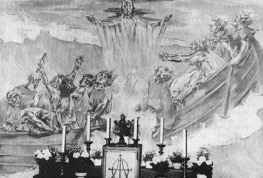Ein Fresko von Hanns Matschulla in der Kapelle Bölingen. Sein Thema ist Christus mit den Jüngern auf dem See Genezareth. Angstgebärden der Apostel, doch Jesus gebietet ihrer Furcht und den sturmgejagten Wellen.
