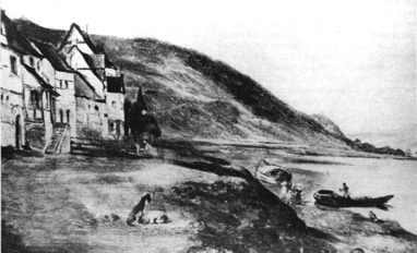 Oberwinter vor dem Bau des hafens und der Umgehungsstraße nach Louis Krevel (c. 1850, linkds das Wirtzsche Haus mit seinem Torbogen)