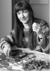 Ingrid Reuter-Cayetano, die alle Aktionen organisiert, ist meist als Sängerin, Tänzerin und Perkussionistin dabei. Die 1956 in Ahrweiler geborene Künstlerin studierte an der Fachhochschule für Kunst und Design in Köln. Neun Jahre lebte sie mit ihrem Ehemann in Belize, und auch auf ihre Nadelmalereien hatte diese Zeit großen Einfluss. Ihre meist ebenfalls recht farbenfrohen Vorlagen – eigene Entwürfe, Gemälde oder Fotos – stickte sie auf Filz, Jute, Leinen, Seide, Jeans oder Leinwand. Ausstellungen führten auch sie bereits ins Ausland, und am Wettbewerb um den Europäischen Förderpreis für Stickdesign hat sie erfolgreich teilgenommen. Wie in den Werken ihres Ehemannes, ist auch bei Ingrid Reuter-Cayetano die Darstellung des Menschen ein zentrales Motiv: Eine Belizer Kräuterfrau, mit der sie selbst länger zusammenlebte, eine Mango-Esserin, ihre eigene „Art-Family", die heilige Katharina und die anderen Huteinheiligen der Kreisstadt Ahrweiler hat sie in feinen Nadelmalereien festgehalten.