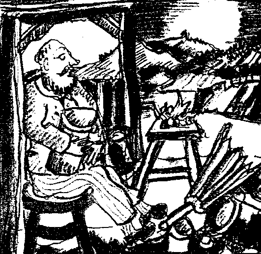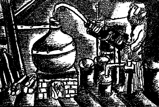 Wenn er in seinem Zufluchtsort, der Remise, werkelte, Versuche anstellte, Neues erdachte, Hergebrachtes verwarf, wurde Pannehännes zu einem Nachfolger der Alchimisten. Natürlich wollte er nicht Quecksilber mit Hilfe des Steines der Weisen in pures Gold verwandeln, doch die Kunst des Destillierens mit lösen, färben, verdampfen, kondensieren und filtrieren, die beherrschte er wie kein Zweiter - aber ein Jünger Cagliostros wollte er nicht werden! Er, gelernter Kupferschmied, hatte eine geheime Destillieranlage erbaut, die sich sehen lassen konnte. Und im Laufe der Zeit war er zu einem Meister in der Kunst des Verwandelns von Holzäpfeln, Krotzbirnen, Beeren und Kräutern geworden; hochprozentige wohltuende Wässerchen erzeugte er in den langen Wintermonaten in seiner Brennerei in der Remise. Was das Bäschen mit flinken Fingern oder dem Rechelkamm in Wald, Hecken und Wiesen sammelte, kam in die Maischebottiche des Tüftlers. Es wurde destilliert zu starken, duftenden, heilsamen Tränk-lein und in kleine, eigentümlich geformte Flaschen abgefüllt.