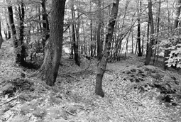 Alte Schürfung am Nordostrand des Wehrer Kessels: Kleine Eisenerzhalde (rechts unten) und Schürfgraben (Bildmitte)