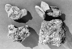Die Reste der Wehrer Hütte: Eisenerzkonkretion (l.o.), Hochofenschlacke (r.o.), Holzkohlestücke (l.u.) und Luppeneisen (r.u.). Durchmesser der Eisenerzkonkretion ca. 6 cm