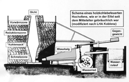 Schema einer mittelalterlichen Eifeler Hochofenanlage (Hochofenanlage Malberg an der Kyll)
