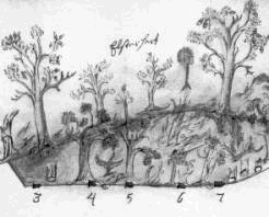 Kartenausschnitt mit Bäumen und Pflanzen sowie wahrscheinlich später eingezeichneten Grenzsteinen