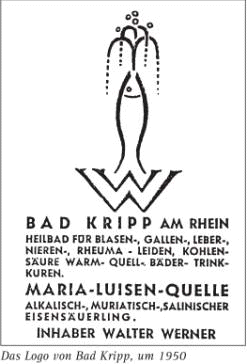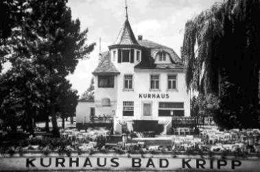 Die Quellbesitzer entschlossen sich zur Errichtung von Kur- und Badeanlagen. Zur Finanzierung eines Badebetriebes wurde eine Gesellschaft mit dem Namen „Heilbadbetrieb Maria-Luisen-Quelle“ in Kripp gegründet. Kurdirektor war Walter Werner, Sohn der Besitzer. Auf dem Quellgrundstück wurde ein kleines bescheidenes Badehaus errichtet und für den ganzjährigen Badebetrieb am 9.9.1934 eröffnet. Das Heilwasser musste in einem im Pumpenhaus befindlichen Heizkessel für die Sitzbäder in den Holzbadezubern erwärmt werden. Zur Hebung und Förderung des Fremdenverkehrs, der Errichtung und Unterhaltung öffentlicher Anlagen und für die Fremdenverkehrswerbung wurde von 25 Ortsbewohnern bereits am 3. Mai 1934 ein „Bade- und Verkehrsverein Kripp a/Rhein e. V.“ gegründet. Vereinsführer war Jean Schlitzer, seine Vertreter Graf Taveggi und Peter Dahm jun. Kripp erhielt 1935 die offizielle Anerkennung als Heilbad.4) Als aufstrebender kleiner Kurort zog Kripp in seiner reizvollen Rheinlage schnell Badegäste an, viele wurden Stammgäste. Der Badebetrieb florierte aber auch durch zahlreiche Gäste der NS-Gemeinschaft KraftdurchFreude (KdF) und nahm eine günstige Entwicklung. 1937 eröffnete Dr. Dr. Hermann Karsten im ehemaligen Schwesternheim auf dem Batterieweg ein Sanatorium als Privatkrankenanstalt. Es verfügte über die erste Sauna Deutschlands. Dr. Dr. Karsten führte im Sanatorium seine Zahnartzpraxis, bot aber auch eine reiche Palette von Möglichkeiten an ambulanten, offenen und geschlossenen Badekuren mit der Heilquelle an. Sein Sanatorium empfahl sich u. a. bei Erkältungskrankheiten, Nervenleiden, Rheuma, Stoffwechselerkrankungen und Kreislaufstörungen. Zu seinen Naturheilverfahren gehörten Anwendungen nach Pfarrer Kneipp, aber auch Duft-, Farb- und Tontherapien sowie das Japanbad und eine ärztlich geleitete Heilsauna.