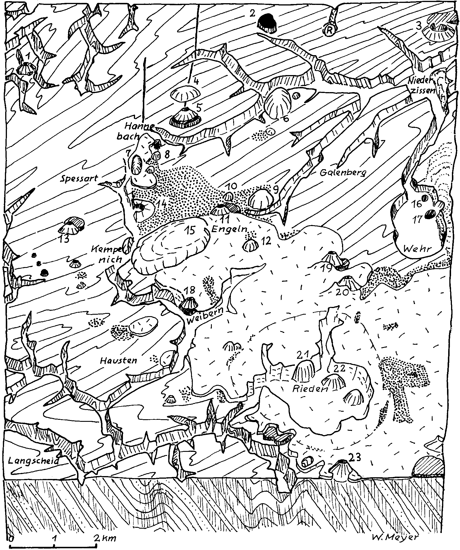 13 Steinrausch, 14 Palagonit-Tuffring, 15 Engelner Kopf (Phonolith),